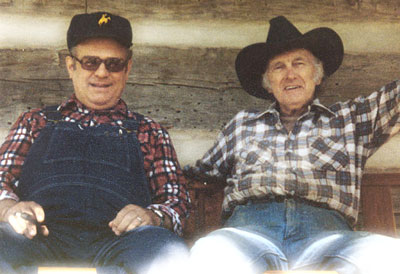 Jim Peva and Bill Monroe at Bill Monroe's Log Cabin home 1986. Photo Copyright Jim Peva |
